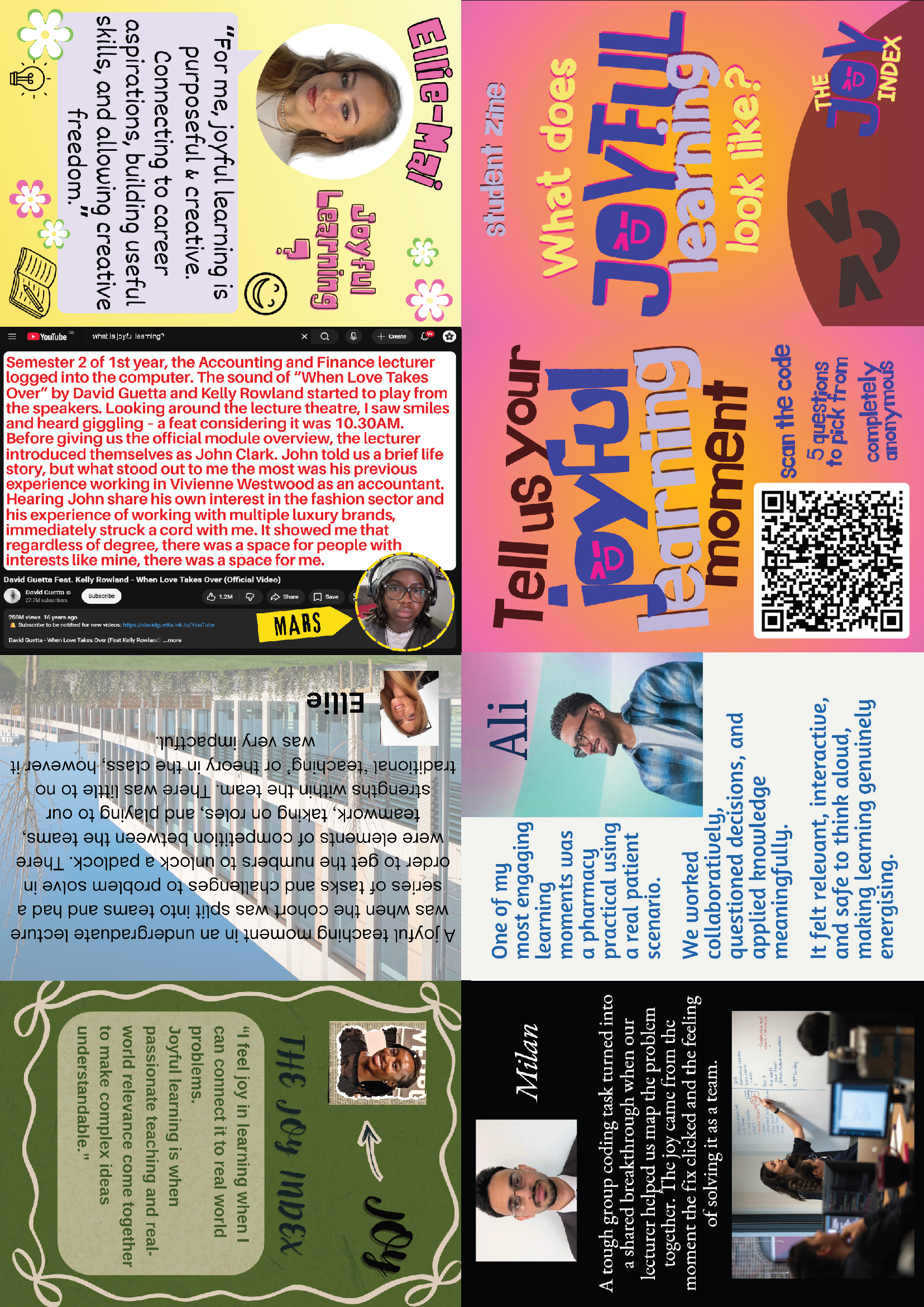 In our meetings, as we were working through what the research actually needed to do, the zine emerged. Six students — Mars, Ali, Milan, Ellie, Ellie-Mai, and Joy — took the moments they'd described in their applications and made them visible. As lived experience, rendered in their own words and their own aesthetic, laid out on a page that asks other students: what does joyful learning look like for you?
